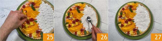 Disponha por cima os pedaços de fruta incluindo as framboesas e algumas folhinhas de hortelã 25, depois dê um leve movimento ao creme com as costas de uma colherinha 26. A sua torta tropical está pronta para ser servida 27!