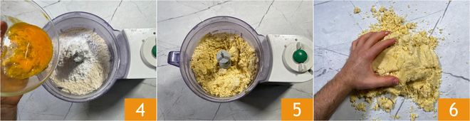 Adicione o açúcar de confeiteiro e os ovos 4 e ligue o processador mais alguns instantes 5. Transfira a mistura para a superfície de trabalho e sove rapidamente com as mãos 6, apenas o tempo de formar um disco. Envolva-o em filme plástico e deixe firmar na geladeira por uma hora.