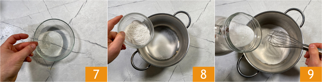 Passe ao creme de coco: coloque a gelatina de molho em água fria 7. Misture a farinha de arroz e o açúcar em uma panela 8, depois despeje o leite de coco enquanto mexe com um batedor para evitar a formação de grumos 9.