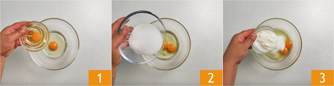 Para preparar o bolo de iogurte com gotas de chocolate, coloque em uma tigela os ovos 1 com o açúcar 2 e o iogurte 3.