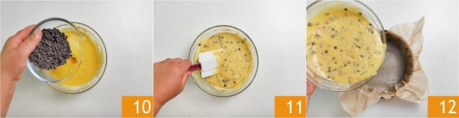 Adicione também as gotas 10 e misture uma última vez com a espátula 11; apenas o tempo necessário para obter uma massa homogênea. Em seguida, despeje em uma forma de 22 cm revestida com papel manteiga 12.