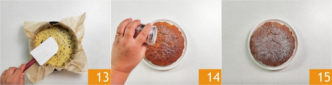Nivele bem a superfície 13 e asse em forno estático pré-aquecido a 180°C por 45 minutos. Antes de retirar o bolo do forno, faça sempre o teste do palito. Deixe o bolo esfriar com a porta do forno ligeiramente aberta. Depois, desenforme, retire da forma e polvilhe com açúcar de confeiteiro 14 antes de servir 15.