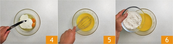 Adicione as sementes que você retirou de uma vagem de baunilha 4 e bata com um batedor de mão 5. Assim que todos os ingredientes estiverem bem misturados, adicione também a farinha peneirada 6.