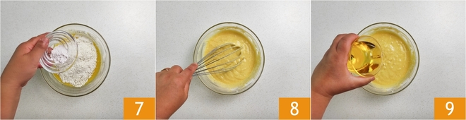 Por último, peneire também o fermento e adicione à massa 7; misture bem com um batedor até obter uma mistura lisa e sem grumos; depois adicione o óleo 9 e misture bem para incorporá-lo.