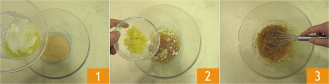 Para preparar o bolo de limão sem ovos, derreta a manteiga em fogo baixo e deixe amornar. Em seguida, despeje em uma tigela com o açúcar mascavo 1, adicione a casca de limão 2. Misture os ingredientes com um batedor 3.