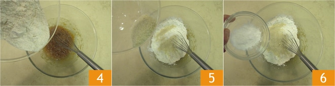 Adicione a farinha de trigo 4, a farinha de amêndoas 5, o amido de milho e o fermento 6.