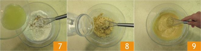 Misture rapidamente, em seguida adicione o suco de limão 7 e o leite em temperatura ambiente 8. Misture os ingredientes até obter uma massa cremosa e homogênea 9.