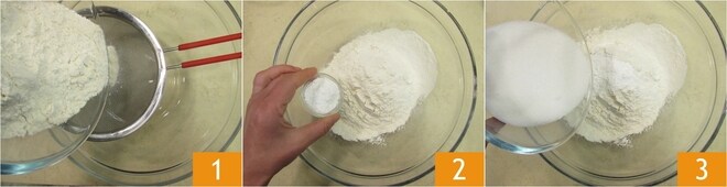 Para preparar a torta de maçã com água, antes de tudo peneire a farinha em uma tigela 1, depois adicione o fermento 2 e o açúcar 3. Misture os ingredientes secos com um batedor de mão.