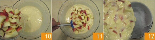Adicione também as maçãs em cubos à mistura 10 e misture com uma espátula para incorporá-las uniformemente 11. Despeje a massa obtida em uma forma de 22 cm de diâmetro forrada com papel manteiga 12.
