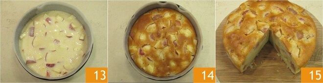 Asse em forno estático pré-aquecido a 180° por cerca de 60 minutos, verificando o cozimento com um palito 13. Uma vez assada, retire do forno e deixe esfriar 14 antes de servir sua torta de maçã com água 15!