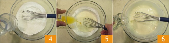 Enquanto continua a misturar, adicione a água em fio 4, o suco de laranja coado 5 e o óleo de sementes 6.