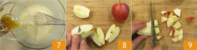 Por fim, adicione a casca ralada da laranja 7 e misture novamente. Neste ponto, lave as maçãs e corte-as primeiro em fatias 8 e depois em cubos irregulares, sem descascá-las 9.