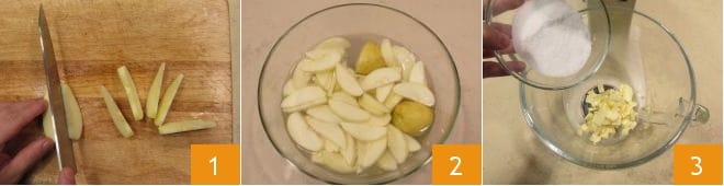 Para preparar o bolo de maçã e Nutella, primeiro descasque as maçãs e corte-as em pedaços de meio centímetro 1, coloque os pedaços em uma tigela cheia de água fria acidulada com o suco de limão para não escurecer e cuide da massa. Coloque em uma batedeira equipada com o batedor a manteiga previamente amolecida junto com o açúcar 3 e bata os ingredientes até formar um creme branco e espumoso.