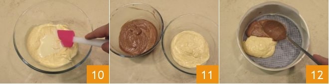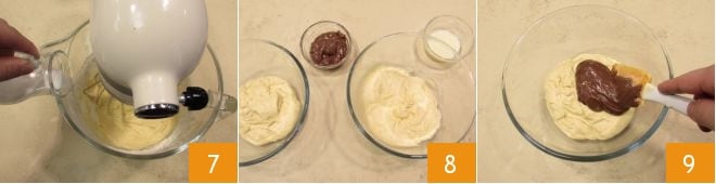 alternando a adição do leite à temperatura ambiente 7. Misture bem os ingredientes, depois divida a massa em duas partes iguais 8 e incorpore em uma tigela a Nutella 9