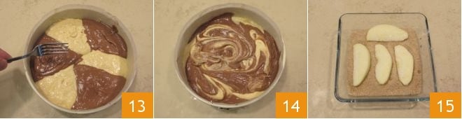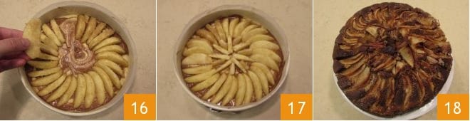 Coloque os pedaços sobre o bolo criando um motivo em espiral (16-17). Asse o bolo em forno estático pré-aquecido por cerca de 55 minutos a 180° (em forno ventilado por 45 minutos a 160°). Nos últimos minutos, coloque sobre o bolo uma folha de papel alumínio para não escurecer demais o bolo. Verifique o cozimento testando com um palito: se ao espetar o bolo, não restarem resíduos no palito, o doce estará cozido. Assim que estiver pronto, retire o bolo do forno 18 e deixe esfriar antes de servir.