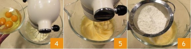 Adicione os ovos à temperatura ambiente um de cada vez 4, o sal e bata por pelo menos 5 minutos, até obter uma mistura homogênea e sem grumos 5. Adicione à mistura a farinha previamente peneirada com o fermento 6