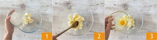 Para preparar a esfarelada de maçãs, comece pela massa. Em uma tigela, coloque a manteiga junto com o açúcar 1. Amoleça com uma colher de pau até ficar cremoso 2. Adicione o ovo 3 e misture até que esteja bem absorvido.