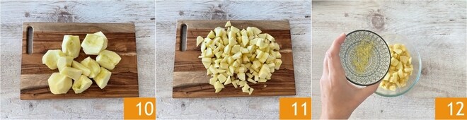 Prepare o recheio de maçãs e amaretti. Descasque as maçãs, corte ao meio, retire o miolo e depois corte em 4 fatias 10. De lá, corte em cubos de 1 cm 11. Transfira os cubos de maçã para uma tigela e adicione a casca de limão 12.