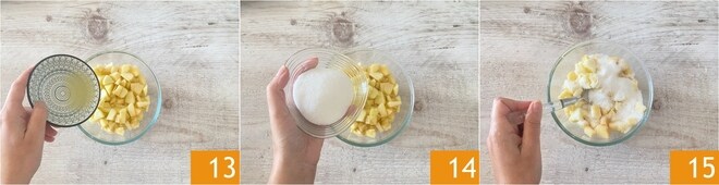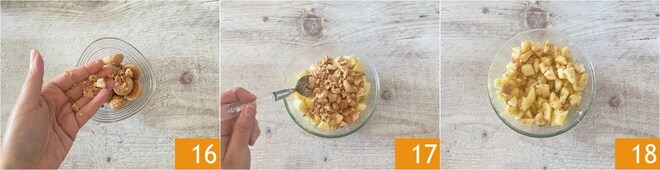 Esmague os biscoitos amaretti grosseiramente com as mãos 16 e adicione-os às maçãs 17. Misture bem 18.