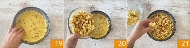 Unte e enfarinhe uma forma de fundo removível de 20 cm de diâmetro. Coloque ¾ da massa no fundo da forma, compactando com as mãos, de modo a cobrir todo o fundo e elevar as bordas para conter o recheio 19. Despeje dentro as maçãs com os amaretti 20, nivele e cubra com o restante da massa esfarelada 21.
