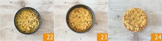 Tente cobrir completamente as maçãs, sem pressionar desta vez 22. Asse a esfarelada de maçãs em forno estático, pré-aquecido a 180 °C por cerca de 35 minutos. Retire do forno 23 e deixe esfriar completamente antes de retirá-la da forma 24 e servir.