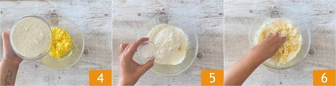 Incorpore a farinha de trigo previamente peneirada 4 e o fermento para bolos também peneirado 5. Misture com a ponta dos dedos 6 até obter uma mistura esfarelada.