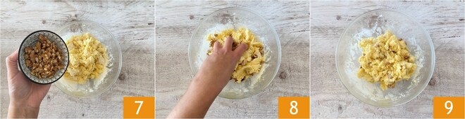 Neste ponto, adicione também as nozes 7 e dê mais uma leve misturada 8 até integrar os ingredientes 9. Mantenha na geladeira até o uso.