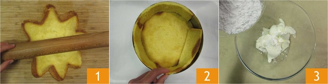 Para preparar o bolo de pandoro e Nutella®, com um rolo, abra as fatias de pandoro até cerca de ½ cm 1. Corte uma delas com um anel de 18 cm, coloque o mesmo anel em uma bandeja onde você colocou papel manteiga. Coloque dentro a fatia cortada que será a base. Corte a outra fatia aberta de pandoro em tiras de 5 cm de espessura, elimine as extremidades irregulares para nivelar e forre a borda do anel 2. Para rechear: coloque a gelatina para hidratar em água fria por pelo menos 10 minutos. Em uma tigela, coloque o mascarpone e o açúcar de confeiteiro 3.