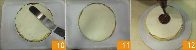 e nivele a superfície com uma espátula 10. Transfira o bolo para a geladeira por pelo menos 2 horas. Uma vez firme 11, comece a decorar com Nutella® colocada em um saco de confeitar com bico frisado: você deve fazer uma espiral para cobrir toda a superfície, pode começar do centro e fazer círculos concêntricos 12.
