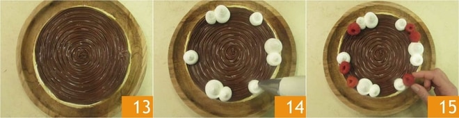 Uma vez coberta toda a superfície 13, decore com picos de chantilly, colocados em um saco de confeitar com bico liso 14. Alternar com framboesas 15,