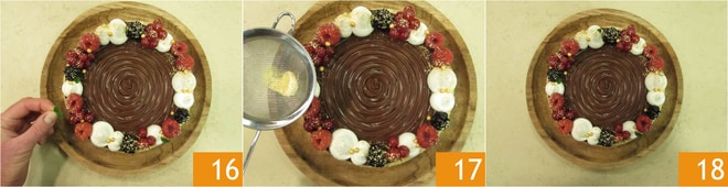 amoras e groselhas, finalize com folhinhas de murta 16. Você pode enriquecer com granulado de pistache, alguns confeitos dourados e um toque mágico: pó de ouro 17. Seu bolo de pandoro e Nutella® está pronto para ser saboreado!