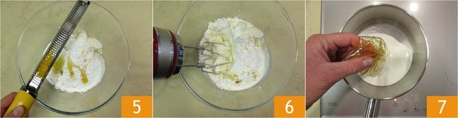 adicione também o mel, as raspas de meio limão e meia laranja 5, e também 200 g de creme de leite fresco líquido. Bata os ingredientes com uma batedeira elétrica 6 até obter um creme liso. Aqueça em uma panela os 20 g restantes de creme de leite fresco líquido e a gelatina escorrida e espremida com delicadeza 7: dissolva muito bem a gelatina.