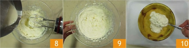 Despeje tudo sobre o creme de mascarpone 8 e bata por alguns segundos com a batedeira elétrica. Uma vez pronto 9, despeje o creme de mascarpone e creme de leite na forma 10