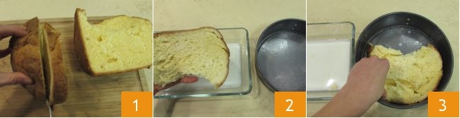 Para preparar o bolo de panetone gastronômico, corte o panetone salgado em fatias de cerca de 3 centímetros 1, obtendo assim 6 fatias. Unte uma forma de 20 cm com fundo removível, molhe uma primeira fatia de panetone no leite 2 e coloque-a no fundo da forma aplicando uma leve pressão 3.