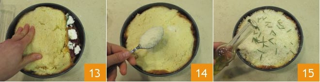 e coloque-as dentro da forma 13, polvilhe a superfície com o Parmesão 14, o alecrim, um fio de azeite 15, a pimenta.