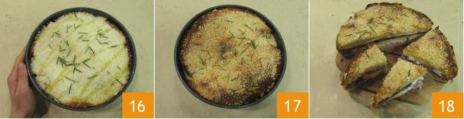Uma vez terminado 16, asse em forno estático pré-aquecido a 200° por 25-30 minutos. Retire do forno 17, depois desenforme seu bolo de panetone gastronômico e sirva em fatias 18.