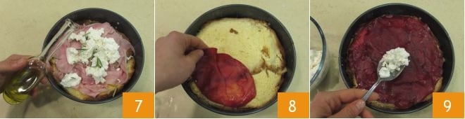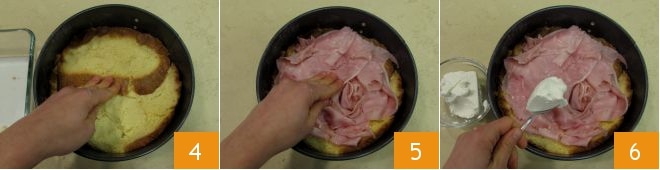 Molhe e coloque também uma segunda fatia fazendo uma leve pressão para cobrir completamente o fundo 4. Distribua as fatias de presunto cozido 5, a ricota 6,