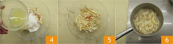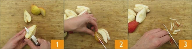 Para preparar a torta de peras e canela, comece pela compota que será usada como recheio. Lave bem os dois tipos de peras, corte-as em fatias e retire o miolo central 1, depois corte-as em fatias de aproximadamente 0,5 cm de espessura 2 e corte-as novamente em julienne para obter palitos.