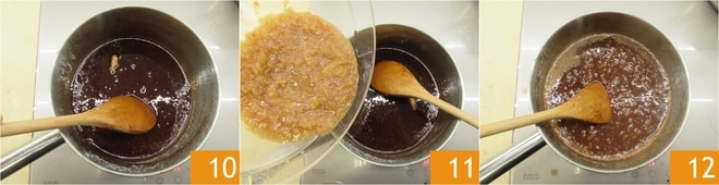 Misture bem e continue cozinhando até que a calda atinja a temperatura de 105° 10. Nesse ponto, adicione as peras 11. Misture novamente e leve à fervura novamente 12. A compota está pronta, transfira-a para uma tigela e deixe esfriar completamente antes de usá-la.