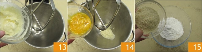 Enquanto isso, prepare também a massa. Aqueça a manteiga a uma temperatura de 25° usando um micro-ondas e transfira para a tigela de uma batedeira 13. Adicione o ovo previamente batido 14. Agora, em outra tigela, coloque o açúcar de confeiteiro e a farinha de amêndoas 15.