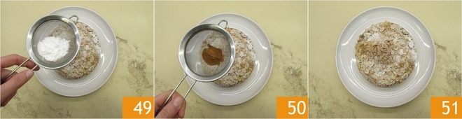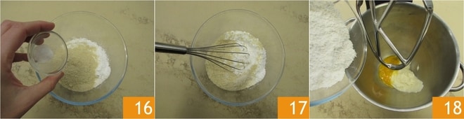 Adicione também o sal 16 e, usando um batedor, misture bem 17. Despeje os ingredientes secos na tigela da batedeira 18.