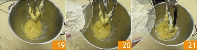 Agora ligue a máquina, com o gancho em forma de folha, e misture o composto por alguns segundos 19. Se ficarem resíduos na borda da tigela, retire o gancho e use-o para misturar o composto. Agora adicione 63 g de farinha tipo 1 20 e misture rapidamente até que seja absorvida. Em seguida, adicione os restantes 179 g de farinha 21.