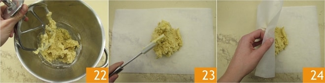 Trabalhe a massa rapidamente até incorporar tudo 22. Transfira a massa para uma folha de papel manteiga de 30x40 cm 23, não se preocupe se parecer muito mole ou com aparência pouco homogênea. A consistência está correta quando, ao dobrá-la sobre si mesma, ela se desprende do papel sem adicionar farinha 24.