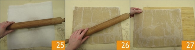 Dê à massa uma forma retangular, cubra com outra folha de papel manteiga do mesmo tamanho e estenda-a 26. Você deve obter um retângulo perfeito e uma espessura bastante fina 26. Coloque em uma bandeja ou tábua 27 e leve à geladeira por 2-3 horas.