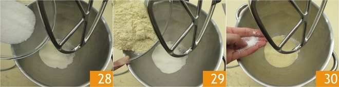Prepare o streusel com a técnica do "sablage". Na tigela da batedeira, coloque a farinha tipo 1, o açúcar 28, a farinha de amêndoas 29 e uma pitada de sal 30. Com a ajuda do gancho em forma de folha, misture os ingredientes secos.
