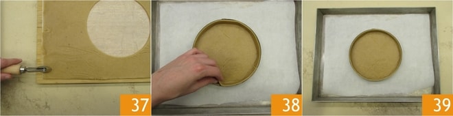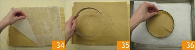 Após os tempos de descanso das várias preparações, só resta montar a torta. Retire a massa da geladeira e remova a folha de papel superior 34. Agora, usando um disco perfurado de 17 cm, corte a base da torta 35. Unte o disco e coloque-o em uma assadeira forrada com papel manteiga e transfira o disco de massa para dentro 35.