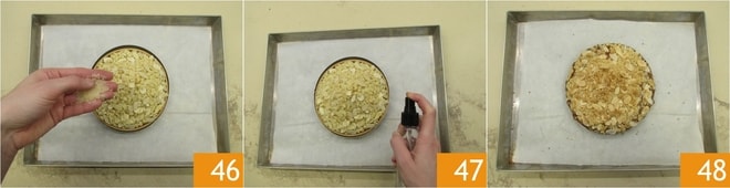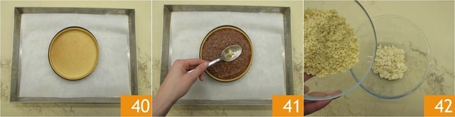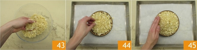 Agora, passe para a cozedura. Asse em forno estático pré-aquecido a 165° por cerca de 18 minutos. Retire do forno 40 e deixe esfriar. Transfira a compota para dentro, você deve obter uma camada alta de 1 cm. Nivele bem com as costas da colher. Coloque as amêndoas em lâminas em uma tigela e adicione o streusel 42.