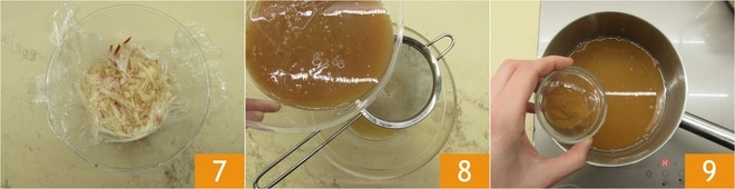 Transfira as peras para uma tigela, cubra com filme plástico em contato 7 e deixe esfriar. Em seguida, coloque na geladeira por 8 horas. Após esse tempo, retire as peras da geladeira e coe para separar a fruta da água de vegetação 8, que você colocará em outra panela. Aqueça em fogo moderado e adicione a canela 9.
