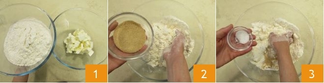 Para preparar a torta de pêssegos, primeiro prepare a massa: em uma tigela, adicione a manteiga fria em pedaços com a farinha 1 e proceda com a arenização, ou seja, esfarele a mistura com as mãos até obter uma consistência arenosa, em seguida adicione o açúcar mascavo 2 e o sal 3 e trabalhe mais um pouco com as mãos.