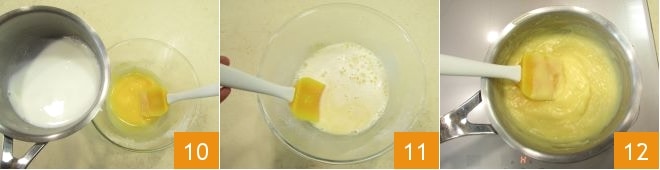Quando o leite estiver quase fervendo, despeje-o na tigela com a mistura de ovos 10, misture bem 11, depois transfira tudo de volta para a panela e deixe o creme engrossar em fogo baixo, mexendo continuamente, até obter uma consistência fluida e não excessivamente compacta 12.